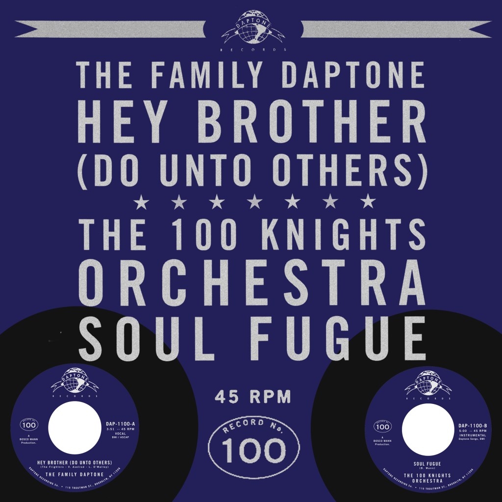 Daptone Records veröffentlichen ihre einhundertste ’45 und zeigt eine beispiellose Zusammenarbeit zwischen den Künstlern des Labels, die am 28. Juni erscheint. Der Song auf Seite A „Hey Brother (Do Unto Others)„, sind die verstorbenen Monarchen des Labels zu hören, Queen Sharon Jones und King Charles Bradley, außerdem noch Saun & Starr, The Frightnrs, James Hunter, Naomi Shelton, Duke Amayo und Lee Fields. Sie alle singen einen ernsthaften Appell für Brüderlichkeit, untermalt von einem Groove, der von Mitgliedern der Dap-Kings und der Menahan Street Band gespielt wird.